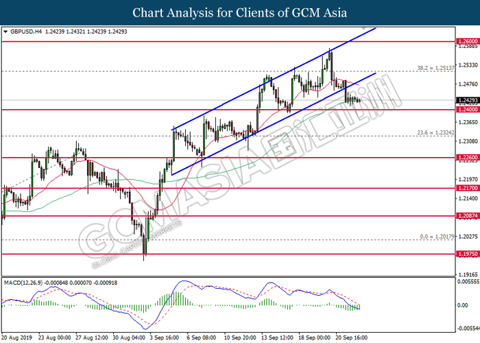 GBP/USD telah didagang di dalam saluran sisi susulan sementara para pelabur menunggu keputusan Mahkamah Agung UK terhadap kes pergantungan Parlimen. Menurut kepada Bloomberg, keputusan yang mengenai kesahihan Boris Jonson’s untuk menggantungkan Parlimen yang akan diumumkan oleh Mahkamah Agung pada hari Selasa pukul 6PM waktu Malaysia. Sekiranya mahkamah mengisytiharkan bahawa nasihat Johnson kepada Queen atas penggantungan Parlimen adalah haram, Pound Sterling akan mencatat penurunannya susulan dengan peningkatan ketidakpastian risiko politik. Selain itu, Bank Pusat England telah menetapkan kadar faedah sebanyak 0.75% pada minggu lepas. Walau bagaimanapun, menurut kepada Pusat Bank UK, mereka menegaskan bahawa peristiwa politik tersebut akan meningkatkan ketegangan perdagangan terhadap British dan Eropah. Sentimen tersebut juga bermakna bahawa ekonomi akan mengalami kemelesetan susulan dengan penangguhan Brexit dan mendorong Pusat Bank UK untuk melaksanakan dasar monetari pengembangan untuk meningkatkan pertumbuhan ekonomi. Sebaliknya, Yen Jepun mencatat kenaikannya berikutan dengan sentimen risko yang makin berkurangan selepas data Eropah yang buruk dibebaskan. Semalam, tiada data dari zon Eropah yang mencapai jangkaan pasaran. Prospek pesimisme terhadap pertumbuhan ekonomi dunia telah meningkatkan sentimen penghindaran risiko dan memberi tekanan bullish kepada aset selamat seperti Jepun Yen. Semasa penulisan, GPB/USD telah mencatat kenaikan sebanyak 0.07% ke 1.2436 manakala EUR/USD meningkat sebanyak 0.02% ke 107.545.