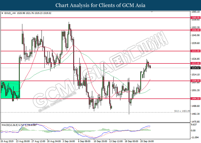 GOLD_, H4: Harga emas telah didagang dengan lebih rendah selepas ia berundur dari tahap rintangan 1523.00. MACD yang memaparkan penyusutan pada momentum menaik mencadangkan harganya untuk didagang dengan lebih rendah bagi jangka pendek sebagai pembetulan teknikal.