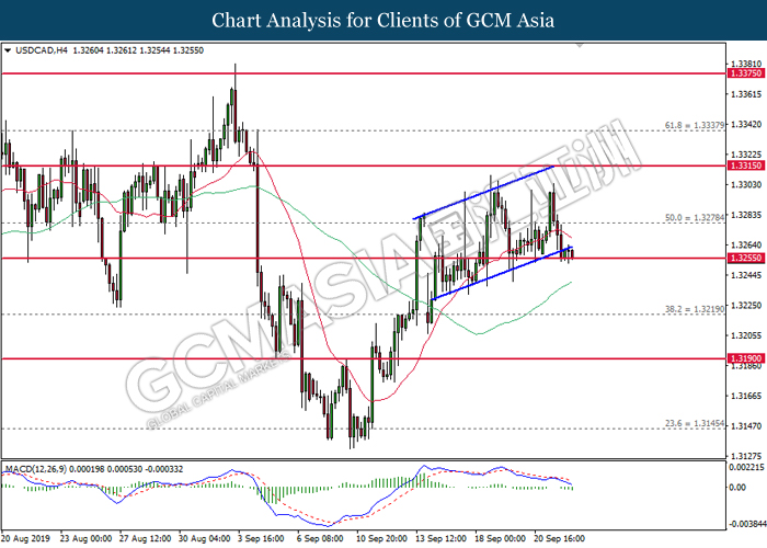 USDCAD, H4: USDCAD telah didagang dengan lebih rendah sementara kini menguji di tahap sokongan 1.3255. MACD yang memaparkan isyarat bearish mencadangkan pasangan ini untuk meneruskan kerugiannya selepas pemecahan berlaku di 1.3255.