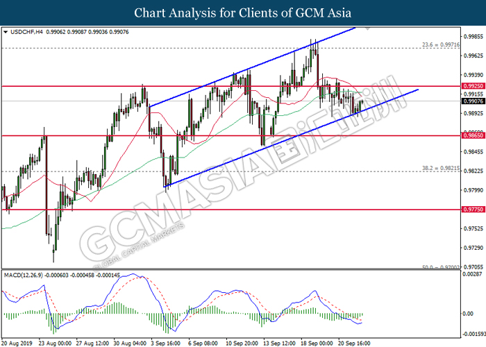 USDCHF, H4: USDCHF telah didagang dengan lebih tinggi selepas ia melantun dari paras rendahnya. MACD yang memaparkan penyusutan pada momentum menurun mencadangkan pasangan ini untuk meningkat bagi jangka pendek.