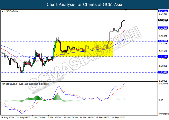USDCAD, H4: USDCAD telah didagang dengan lebih tinggi susulan dengan pemecahan pada tahap rintangan sebelumnya 1.3330. Namun, MACD yang memaparkan isyarat momentum bullish yang berkurangan mencadangkan pasangan ini untuk didagang dengan lebih rendah sebagai pembetulan teknikal jangka pendek ke arah tahap sokongan terkini 1.3330.