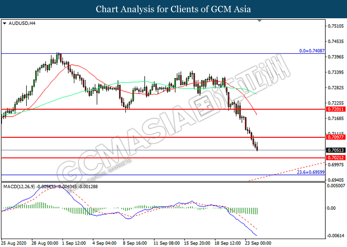 AUDUSD, H4: AUDUSD telah didagang dengan lebih rendah selepas ia memecah tahap sokongan terdahulu 0.7095. MACD yang memaparkan momentum bearish mencadangkan pasangan ini untuk melanjutkan kerugiannya ke arah tahap sokongan 0.7020.