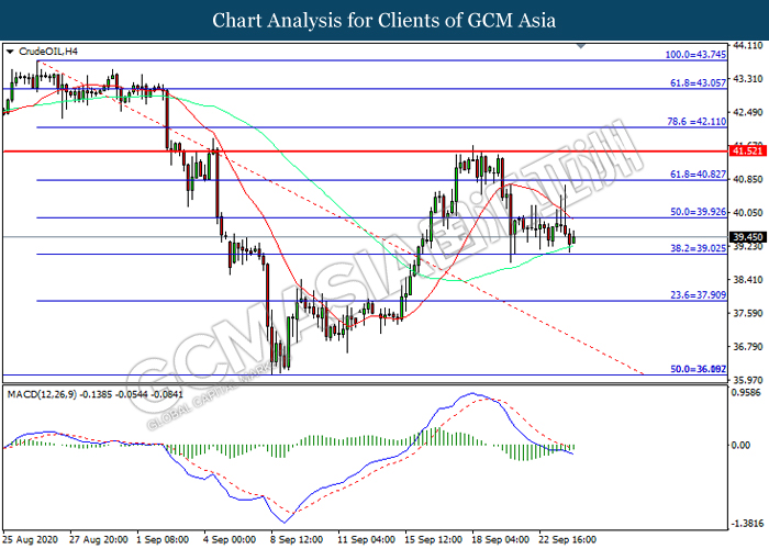 CrudeOIL, H4: Harga minyak mentah telah didagang dengan lebih rendah sementara kini menguji di tahap sokongan 39.05. Namun, MACD yang memaparkan momentum bearish yang berkurangan mencadangkan pasangan ini untuk mengalami pembetulan teknikal bagi jangka pendek.