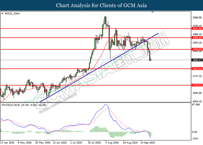 GOLD_, Daily: Harga emas telah didagang dengan lebih rendah selepas ia memecah tahap sokongan terdahulu 1909.70. MACD yang memaparkan momentum bearish mencadangkan komoditi ini untuk melanjutkan kerugiannya ke arah tahap sokongan 1813.90.