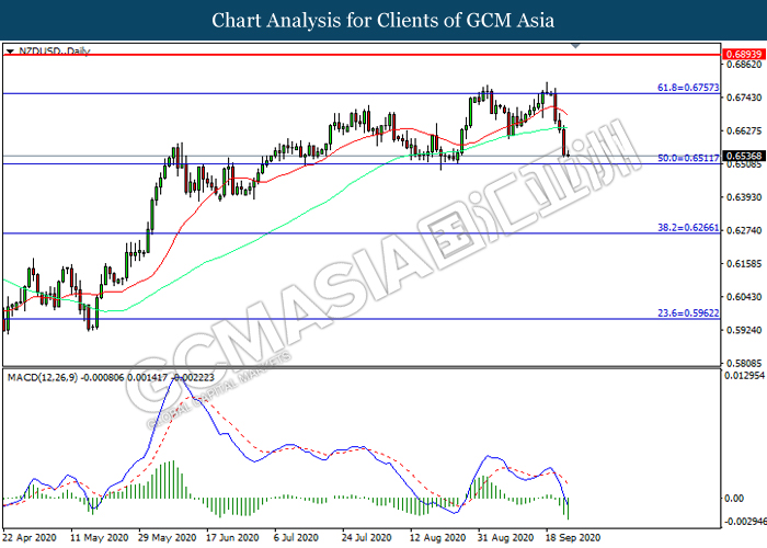 NZDUSD, Daily: NZDUSD telah didagang dengan lebih rendah sementara kini menguji di tahap sokongan 0.6510. MACD yang memaparkan momentum bearish mencadangkan pasangan ini untuk melanjutkan kerugiannya selepas ia memecah tahap sokongan tersebut.