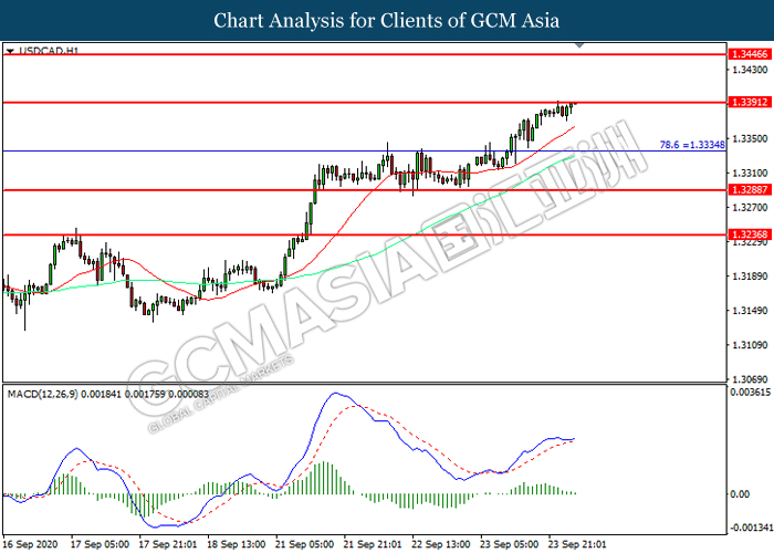 USDCAD, H1: USDCAD telah didagang dengan lebih tinggi sementara kini menguji di tahap rintangan 1.3390. Namun, MACD yang memaparkan momentum bullish yang berkurangan mencadangkan pasangan ini untuk mengalami pembetulan teknikal bagi jangka pendek.
