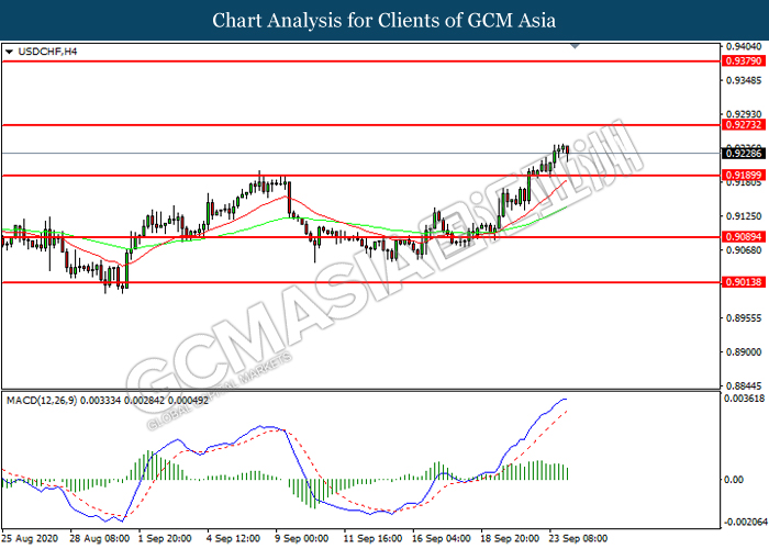 USDCHF, H4: USDCHF telah didagang dengan lebih tinggi selepas ia memecah tahap rintangan terdahulu 0.9190. Namun, MACD yang memaparkan momentum bullish yang berkurangan mencadangkan pasangan ini untuk mengalami pembetulan teknikal bagi jangka pendek.