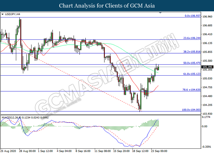 USDJPY, H4: USDJPY telah didagang dengan lebih tinggi sementara kini menguji di tahap rintangan 105.45. Namun, MACD yang memaparkan momentum bullish yang berkurangan mencadangkan pasangan ini untuk mengalami pembetulan teknikal bagi jangka pendek.