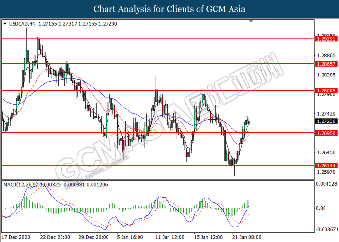 USDCAD, H4: USDCAD telah didagang dengan lebih tinggi selepas ia memecah tahap rintangan sebelumnya di 1.2695. MACD yang menunjukkan isyarat momentum bullish yang berterusan mencadangkan pasangan ini untuk melanjutkan keuntungannya dan menuju ke arah tahap rintangan di 1.2800.