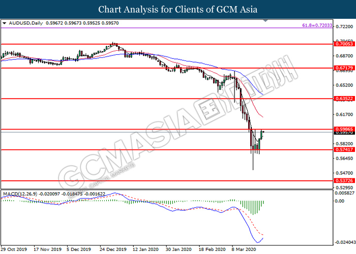 AUDUSD, Daily: AUDUSD telah didagang dengan lebih tinggi sementara ia sedang menguji tahap rintangan di 0.5985. MACD yang memaparkan isyarat momentum bearish yang berkurangan mencadangkan pasangan ini untuk melanjutkan keuntungannya selepas ia memecah tahap rintangan di 0.5985.