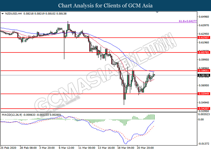 NZDUSD, H4: NZDUSD telah didagang dengan lebih tinggi selepas ia melantun dari tahap sokongan di 0.5595. MACD yang memaparkan isyarat momentum bullish yang berterusan mencadangkan pasangan ini untuk didagang dengan tinggi dan menuju ke arah tahap rintangan di 0.5865.