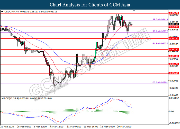 USDCHF, H1: USDCHF telah didagang dengan lebih rendah selepas ia berundur dari tahap rintangan di 0.9840. Namun, MACD yang memaparkan isyarat momentum bearish yang berkurangan mencadangkan pasangan ini untuk mengalami pembetulan teknikal dan menuju ke arah tahap rintangan di 0.9840.