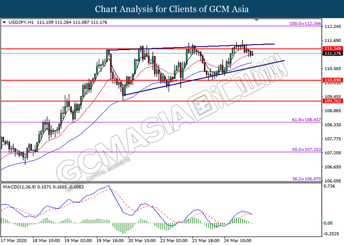 USDJPY, H1: USDJPY telah didagang dengan lebih rendah selepas ia berundur dari tahap tinggi saluran menaik menyempit. MACD yang memaparkan isyarat momentum bullish yang berkurangan mencadangkan pasangan ini untuk melanjutkan kerugiannya dan menuju ke arah tahap sokongan di 110.10.