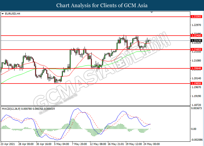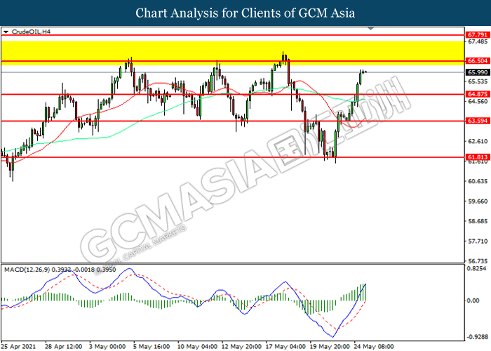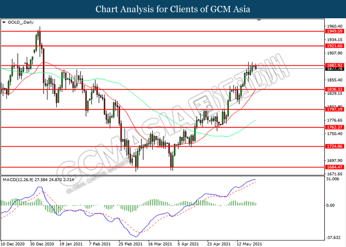 Bagi pasaran komoditi, harga minyak mentah telah meningkat sebanyak 0.05% ke $66.00 se tong semasa penulisan susulan dengan kemajuan vaksinasi Covid-19 yang pantas telah mencetuskan prospek positif untuk resolusi pandemik Covid-19. Menurut kepada data terkini, kes-kes baru Covid-19 dari rantau India telah menurun dalam beberapa minggu kebelakangan dan kadar positif ujian menurun di bawah 2.55 berbanding 36% bulan lalu. Sebaliknya, harga emas telah meningkat sebanyak 0.05% ke $1880.35 se troy auns semasa penulisan susulan dengan penyusutan dalam Dolar AS.