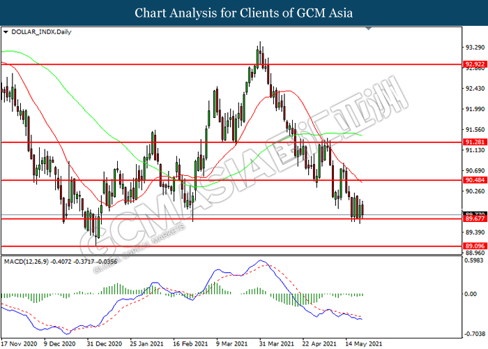 Indeks dolar yang mengukur nilainya terhadap sekumpulan enam mata wang utama telah mencatat kerugiannya susulan dengan para pelabur khuatir terhadap data inflasi AS yang sangat tinggi pada masa yang akan datang. Bacaan data inflasi yang tinggi kemungkinan akan mengurangkan nilai untuk mata wang Dolar AS sambil mendorong para pelabur untuk mengalihkan pelaburan mereka ke arah mata wang lain. Walau bagaimanapun, ekonomi AS terus membuat kemajuan pesat ke arah tujuan Federal Reserve, para pelabur telah bermula menjangkakan bahawa Federal Reserve mungkin akan memberikan penyataan yang lebih hawkish pada masa yang akan datang sambil membuat spekulasi bahawa kadar faedah AS yang lebih tinggi untuk memerangi risiko inflasi. Ramai ahli ekonomi telah menekankan kepentingan untuk Jawatankuasa menyampaikan dengan jelas penilaian kemajuannya ke arah matlamat jangka panjang sambil mengekalkan kadar inflasi pada keadaan stabil. Namun, penyataan keseluruhan dari Federal Reserve adalah tetap kabur, justerunya para pelabur dicadangkan untuk memberikan fokus ke atas data inflasi serta perkembangan dari Federal Reserve pada masa yang akan datang untuk menerima isyarat dagangan yang lanjutnya. Semasa penulisan, Indeks dolar telah menyusut sebanyak 0.20% ke 89.85.