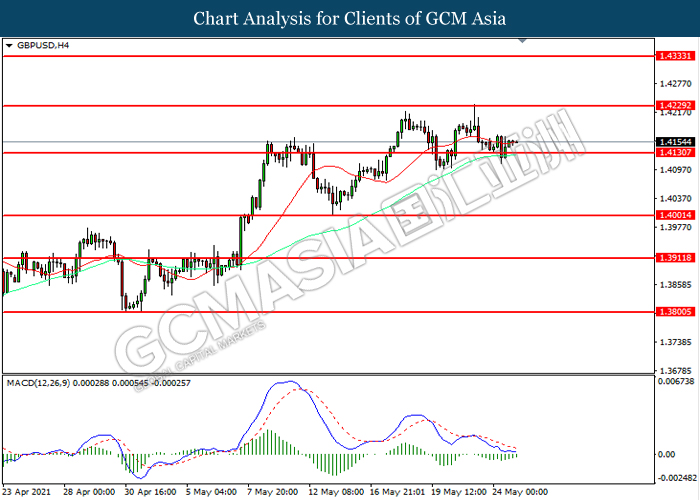 GBPUSD, H4: GBPUSD telah didagang dengan lebih rendah sementara kini menguji di tahap sokongan 1.4130. Namun, MACD yang memaparkan momentum bearish yang berkurangan mencadangkan pasangan ini untuk mengalami pembetulan teknikal bagi jangka pendek.