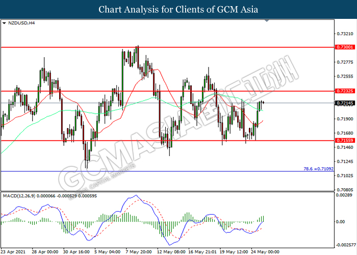 NZDUSD, H4: NZDUSD telah didagang dengan lebih tinggi selepas ia melantun dari tahap sokongan 0.7155. MACD yang memaparkan momentum bullish mencadangkan pasangan ini untuk melanjutkan keuntungannya ke arah tahap rintangan 0.7235.