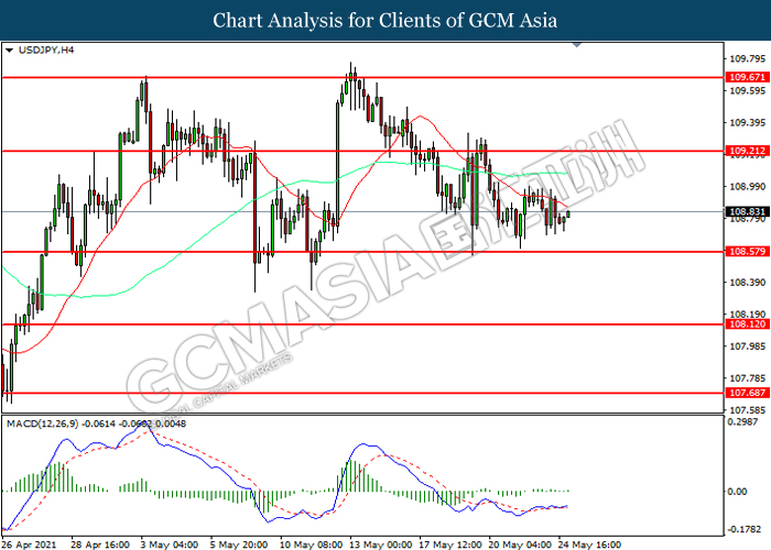 USDJPY, H4: USDJPY telah didagang dengan lebih rendah sementara kini berhampiran dengan tahap sokongan 108.60. Namun, MACD yang memaparkan momentum bullish mencadangkan pasangan ini untuk mengalami pembetulan teknikal bagi jangka pendek.