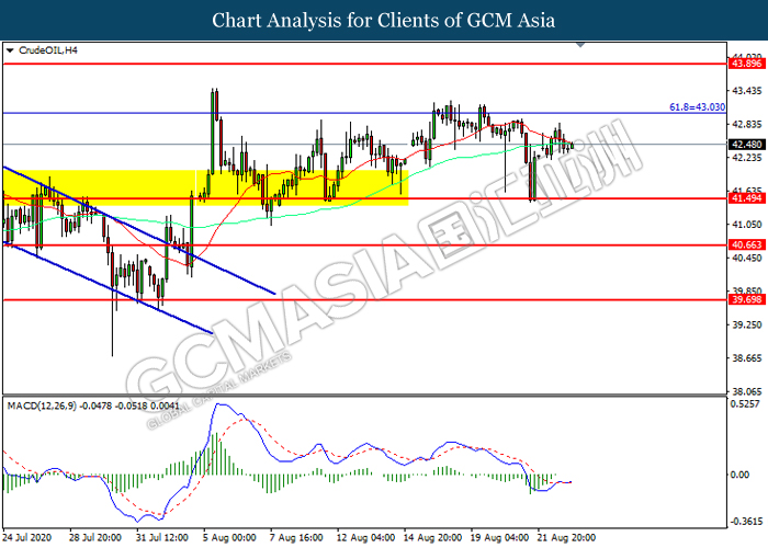 Bagi pasaran komoditi, harga minyak mentah telah melonjak sebanyak 0.24% ke $42.43 se tong semasa penulisan. Pasaran minyak mentah telah melanjutkan keuntungannya selepas syarikat-syarikat tenaga utama telah mengurangkan pengeluaran minyak di kilang minyak U.S. Gulf Coast pada hari Isnin di tengah-tengah ancaman dari Taufan Marco dan Tropical Storm laura. Taufan Tropika Marco dan Laura telah menyerang wilayah minyak utama A.S. dan mengancam akan membawa hujan yang lebat dan angin kencang pada minggu ini. Justerunya, bencana tersebut telah mendorong pengeluar minyak menutup lebih daripada 1 juta tong sehari dalam pengeluaran minyak mentah. Sebaliknya, harga emas telah mencatat keuntungannya sebanyak 0.17% ke 1937.98 se troy auns semasa penulisan semasa penulisan susulan dengan optisme terhadap ebenaran AS untuk rawatan plasma darah bagi menyembuhkan penyakit koronavirus telah meningkatkan sentimen selera risiko, yang mencetuskan penjualan yang ketara ke atas aset selamat emas.