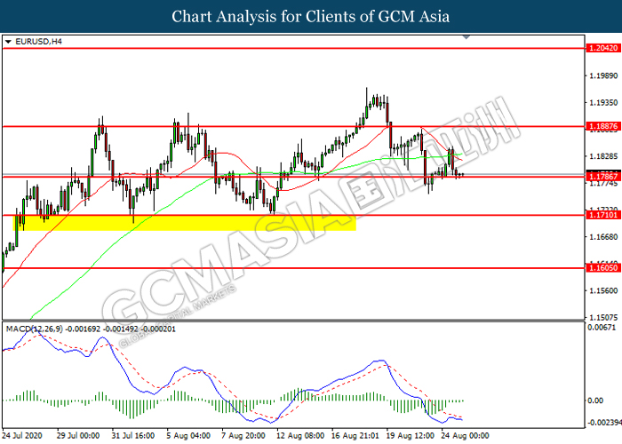 EURUSD, H4: EURUSD telah didagang dengan lebih rendah sementara kini menguji di tahap sokongan 1.1785. Namun, MACD yang memaparkan momentum bearish yang berkurangan mencadangkan pasangan ini untuk mengalami pembetulan teknikal bagi jangka pendek.