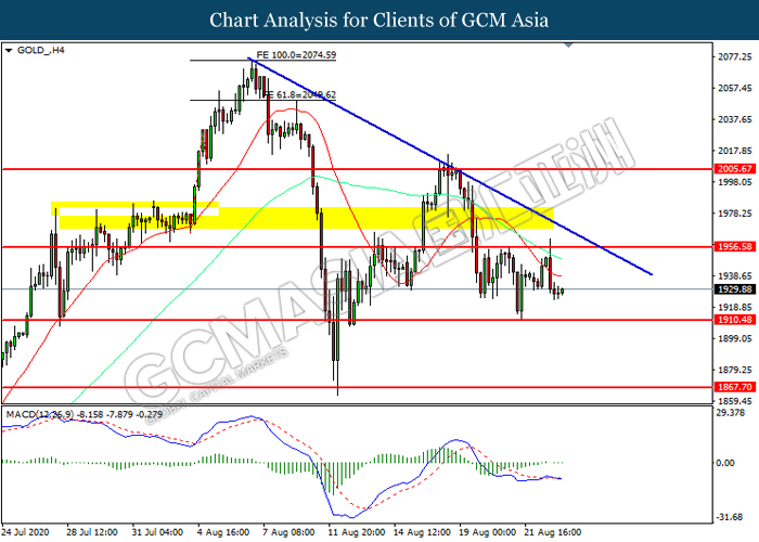 GOLD_, H4: Harga emas telah didagang dengan lebih rendah selepas ia berundur dari tahap rintangan 1956.60. MACD yang memaparkan momentum bearish mencadangkan komoditi ini untuk melanjutkan kerugiannya ke arah tahap sokongan 1910.50.