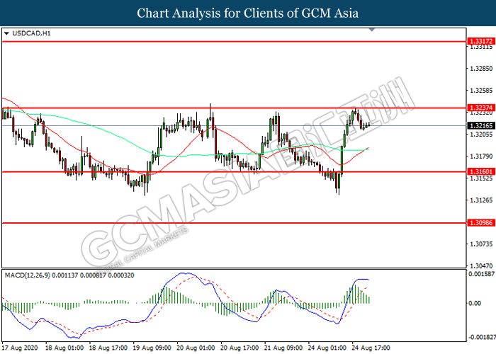USDCAD, H1: USDCAD telah didagang dengan lebih rendah selepas ia berundur dari tahap rintangan 1.3235. MACD yang memaparkan momentum bullish yang berkurangan mencadangkan pasangan ini untuk melanjutkan kerugiannya ke arah tahap sokongan 1.3160.