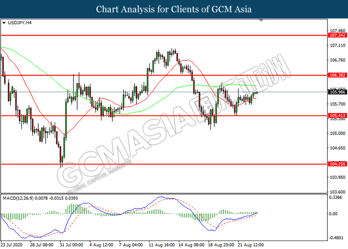USDJPY, H4: USDJPY telah didagang dengan lebih tinggi selepas ia melantun dari tahap sokongan 105.40. MACD yang memaparkan momentum bullish mencadangkan pasangan ini untuk melanjutkan keuntungannya ke arah tahap rintangan 106.40.