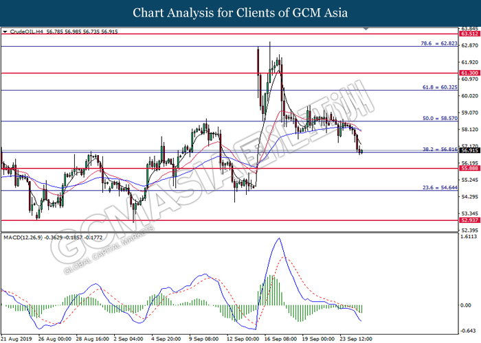 CrudeOIL, H4: Harga minyak mentah telah didagang dengan lebih rendah sementara ia sedang menguji tahap sokongan 56.90. MACD yang memaparkan isyarat bearish mencadangkan harganya untuk menurun selepas ia berjaya memecah tahap sokongan 56.90.
