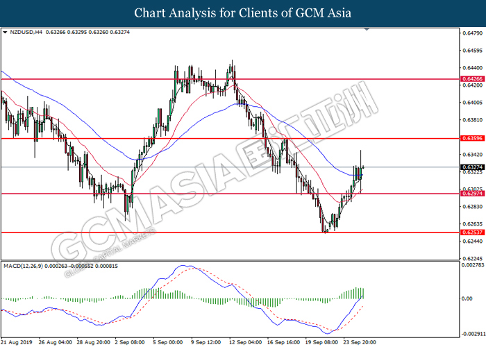 NZDUSD, H4: NZDUSD telah didagang dengan lebih tinggi selepas ia memecah tahap rintangan sebelumnya 0.6295. MACD yang memaparkan isyarat bullish mencadangkan pasangan ini untuk meneruskan keuntungannya ke arah tahap rintangan 0.6360.