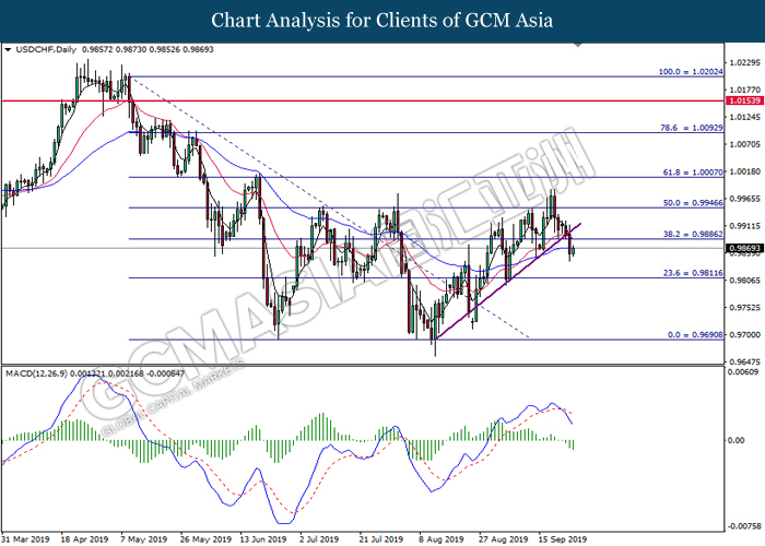 USDCHF, Daily: USDCHF telah didagang dengan lebih rendah susulan dengan pemecahan berlaku pada garisan trend menaik. MACD yang memaparkan momentum menurun mencadangkan pasangan ini untuk didagang dengan lebih rendah and menuju ke arah tahap sokongan 0.9810.