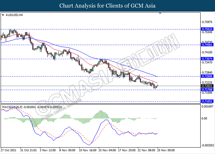 AUDUSD, H4: AUDUSD telah didagang dengan lebih rendah sementara ia sedang menguji berhampiran dengan tahap sokongan 0.7175. Namun, MACD yang memaparkan isyarat momentum bearish yang berkurangan dengan formasi silang emas mencadangkan pasangan ini untuk mengalami pembetulan teknikal dalam jangka pendek ke arah tahap rintangan 0.7260.