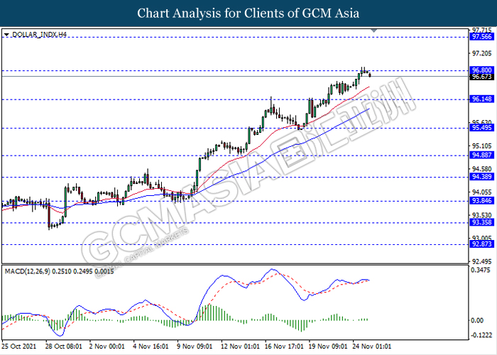 DOLLAR_INDX, H4: Indeks dolar telah didagang dengan lebih rendah susulan dengan pengunduran dari tahap rintangan 96.80. MACD yang memaparkan isyarat momentum bullish yang berkurangan mencadangkan dolar untuk melanjutkan pengundurannya ke arah tahap sokongan 96.15.