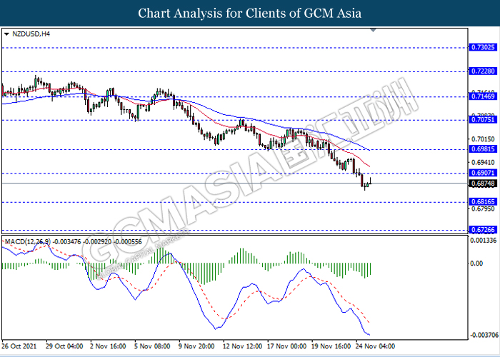 NZDUSD, H4: NZDUSD telah didagang dengan lebih rendah susulan dengan pemecahan pada tahap sokongan sebelumnya 0.6905. Namun, MACD yang memaparkan isyarat momentum bearish yang berkurangan mencadangkan pasangan ini untuk mengalami pembetulan teknikal dalam jangka pendek kembali ke arah tahap 0.6905.