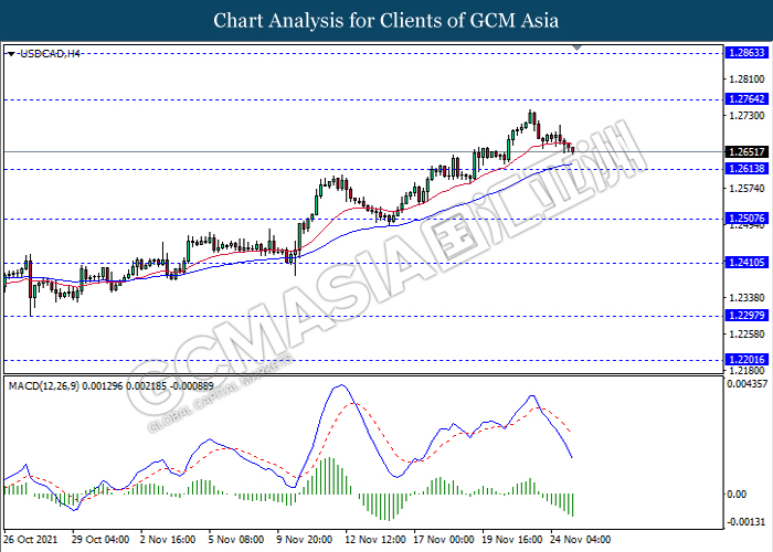 USDCAD, H4: USDCAD telah didagang dengan lebih rendah sementara ia sedang menguji berhampiran dengan tahap sokongan 1.2615. MACD yang memaparkan isyarat momentum bearish mencadangkan pasangan ini untuk melanjutkan kerugiannya selepas ia memecah tahap sokongan tersebut.