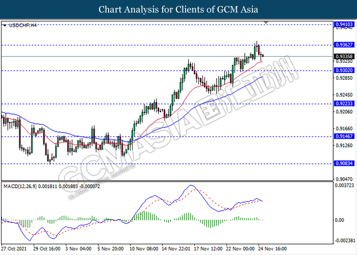 USDCHF, H4: USDCHF telah didagang dengan lebih rendah susukan dengan pengunduran dari tahap rintangan 0.9360. MACD yang memaparkan isyarat momentum bullish mencadangkan pasangan ini untuk melanjutkan pengundurannya ke arah tahap sokongan 0.9300.