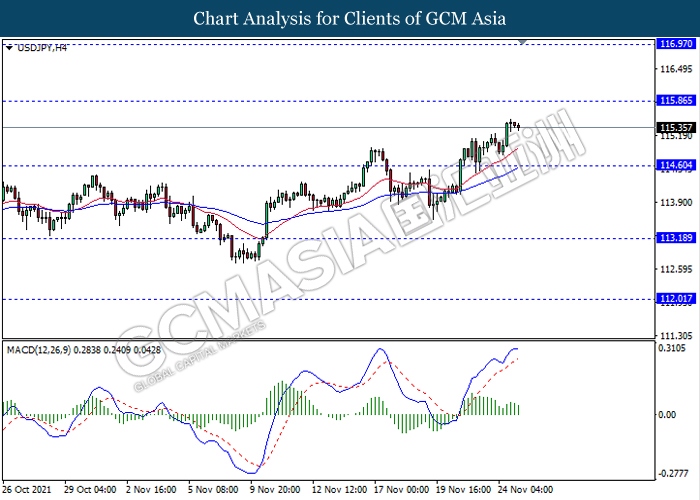 USDJPY, H4: USDJPY telah didagang dengan lebih tinggi susulan dengan pemecahan pada tahap rintangan sebelumnya 114.60. Namun, MACD yang memaparkan isyarat momentum bullish mencadangkan pasangan ini untuk mengalami pembetulan teknikal jangka pendek ke arah tahap sokongan 114.60.