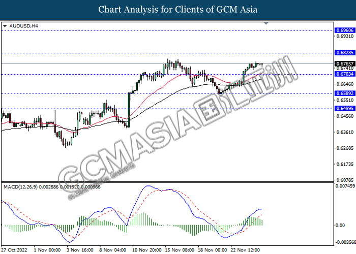 AUDUSD, H4: AUDUSD telah didagang dengan lebih tinggi selepas ia memecah tahap rintangan terdahulu. Namun, MACD yang memaparkan momentum bullish yang berkurangan mencadangkan pasangan ini untuk mengalami pembetulan teknikal.