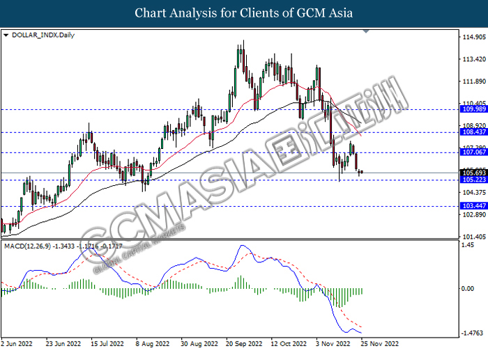 DOLLAR_INDX, Daily: Indeks Dolar telah didagang dengan lebih rendah sementara kini menguji di tahap sokongan. Namun, MACD yang memaparkan momentum bearish yang berkurangan mencadangkan indeks tersebut untuk mengalami pembetulan teknikal.