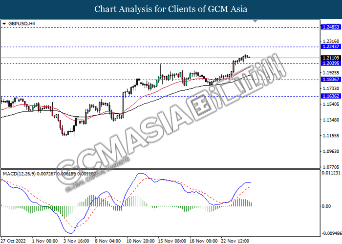 GBPUSD, H4: GBPUSD telah didagang dengan lebih tinggi selepas ia memecah tahap rintangan terdahulu. Namun, MACD yang memaparkan momentum bullish yang berkurangan mencadangkan pasangan ini untuk mengalami pembetulan teknikal.