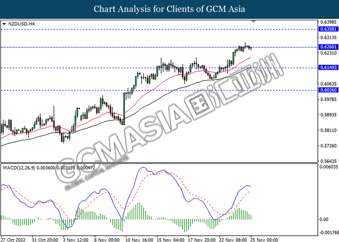 NZDUSD, H4: NZDUSD telah didagang dengan lebih tinggi sementara kini menguji di tahap rintangan. Namun, MACD yang memaparkan momentum bullish yang berkurangan mencadangkan pasangan ini untuk mengalami pembetulan teknikal.