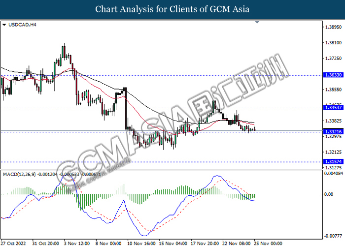 USDCAD, H4: USDCAD telah didagang dengan lebih rendah sementara kini menguji di tahap sokongan. Namun, MACD yang memaparkan momentum bearish yang berkurangan mencadangkan pasangan ini untuk mengalami pembetulan teknikal.