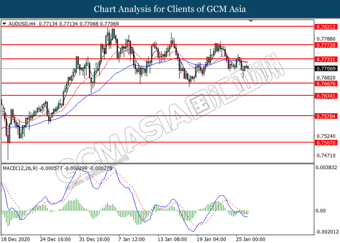 AUDUSD, H4: AUDUSD telah didagang dengan lebih rendah selepas ia berundur dari tahap rintangan di 0.7735. Namun, MACD yang memaparkan momentum bearish yang berkurangan mencadangkan pasangan ini untuk melanjutkan keuntungannya dan menuju ke arah tahap rintangan di 0.7735.