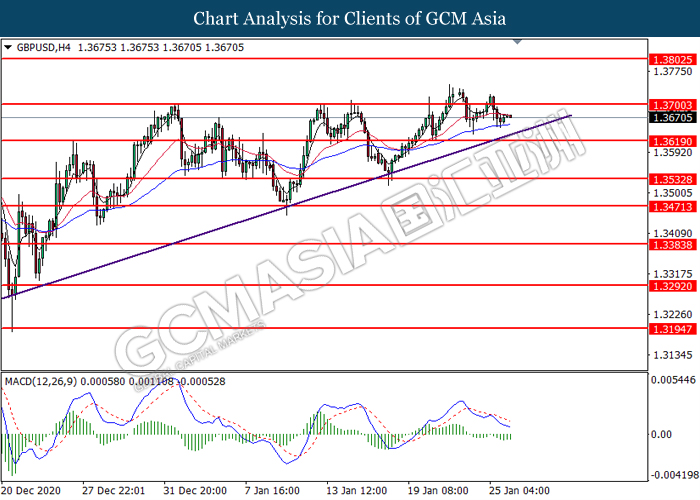 GBPUSD, H4: GBPUSD telah didagang dengan lebih tinggi selepas ia melantun dari tahap yang lebih rendah. MACD yang memaparkan momentum bearish yang berkurangan mencadangkan pasangan ini untuk didagang dengan lebih tinggi ke tahap rintangan di 1.3700.