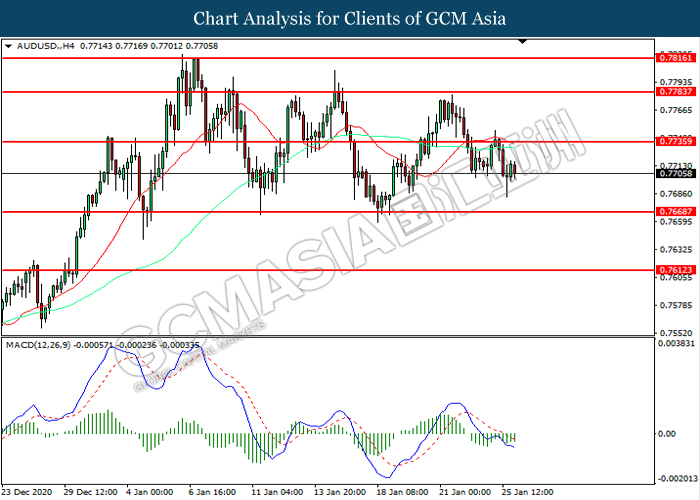AUDUSD, H4: AUDUSD telah didagang dengan lebih rendah selepas ia berundur dari tahap rintangan 0.7735. Namun, MACD yang memaparkan momentum bearish mencadangkan pasangan ini untuk mengalami pembetulan teknikal bagi jangka pendek.