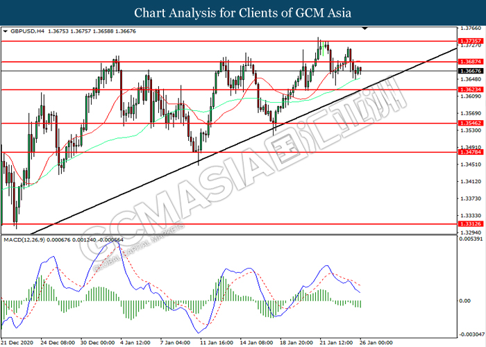 GBPUSD, H4: GBPUSD telah didagang dengan lebih rendah selepas ia memecah tahap sokongan 1.3685. MACD yang memaparkan momentum bearish mencadangkan pasangan ini untuk melanjutkan kerugiannya ke arah tahap sokongan 1.3625.