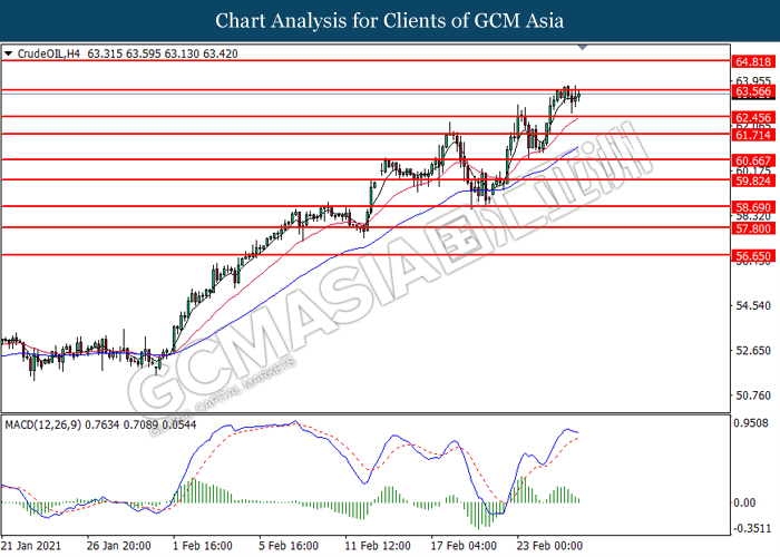 CrudeOIL, H4: Harga minyak mentah telah didagang dengan lebih tinggi sementara ia sedang menguji tahap rintangan di 63.55. MACD yang memaparkan momentum bullish yang berterusan mencadangkan komoditi ini untuk melanjutkan keuntungannya selepas ia memecah tahap rintangan tersebut.