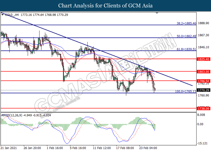 GOLD_, H4: Harga emas telah didagang dengan lebih rendah sementara ia sedang menguji tahap sokongan di 1765.15. MACD yang memaparkan momentum bearish yang berterusan mencadangkan komoditi ini untuk melanjutkan kerugiannya selepas ia memecah tahap sokongan tersebut.