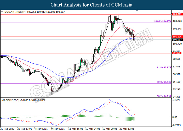 Indeks dolar yang mengukur nilainya terhadap sekumpulan enam mata wang utama menurun susulan dengan pelan stimulus AS telah diluluskan dalam undi Senat. Selepas menghadapi dua kali kegagalan dalam undi yang diketepikan oleh Demokrat berturut-turut semenjak awal minggu ini, ahli politik Amerika Syarikat akhirnya mencapai persetujuan dalam pelan rangsangan terbaru yang bertindak sebagai pemangkin baru untuk menyokong ekonomi negara. Secara terperinci, rangsangan ini terdiri daripada menyediakan jumlah pembayaran sebagai bantuan kepada pembayar cukai, faedah pengangguran dan dana sebanyak $500 bilion untuk menyokong perniagaan tempatan yang ditindas oleh pandemik ini. Hasilnya, pakej rangsangan telah meningkatkan keyakinan pasaran terhadap wabak virus ini, dan ia mendorong para pelabur untuk menjual pegangan mereka di atas dolar selamat sementara memindahkan modalnya ke pasaran yang lebih berisiko. Selain itu, data ekonomi pesimis dari rantau Amerika Syarikat juga terus menyeret daya tarikan dolar. Menurut kepada Census Bureau, data Core Durable Goods Orders AS untuk bulan Februari dibebaskan pada bacaan sebanyak -0.6%, tersasar daripada ramalan ahli ekonomi pada -0.4%. Walau bagaimanapun, bacaan data ini tidak mencerminkan kesan negatif virus dengan sepenuhnya dan dijangka akan jatuh dengan ketara memandangkan wabak itu telah menyeret ekonomi AS pada bulan Mac. Semasa sesi dagangan awal Asia, indeks dolar turun sebanyak 1.07% ke 100.90.