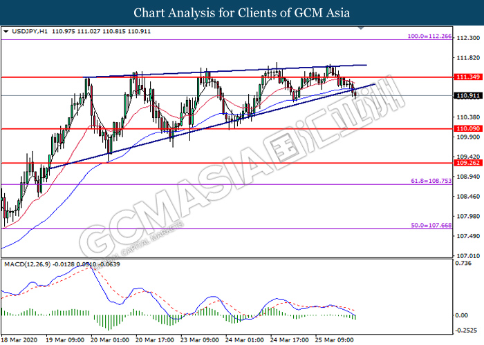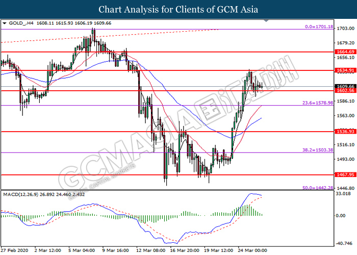 Dalam pasaran komoditi, harga minyak mentah menyusut sebanyak 0.38% ke $24.20 setong di tengah-tengah sentimen pasaran minyak masih kekal huru-hara kerana pandemik virus terus menghantui prospek pasaran minyak. Walau bagaimanapun, kerugian harga minyak terhad selepas data inventori minyak AS menunjukkan simpanan yang lebih kecil daripada jangkaan pasaran. Menurut EIA, data inventori minyak mentah AS dibebaskan pada 1.623 juta, lebih rendah daripada ramalan 2.774 juta. Selain itu, harga emas menurun sebanyak 0.30% ke $1,613.50 satu troy auns kerana pasaran melarikan diri ke aset berisiko selepas pelan rangsangan untuk meningkat kecairan pasaran telah diluluskan oleh kerajaan AS.