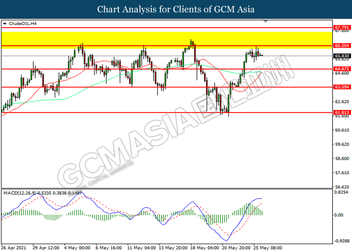 CrudeOIL, H4: Harga minyak mentah telah didagang dengan lebih tinggi sementara kini menguji di tahap rintangan 66.50. Namun, MACD yang memaparkan momentum bullish yang berkurangan mencadangkan komoditi ini untuk mengalami pembetulan teknikal bagi jangka pendek.